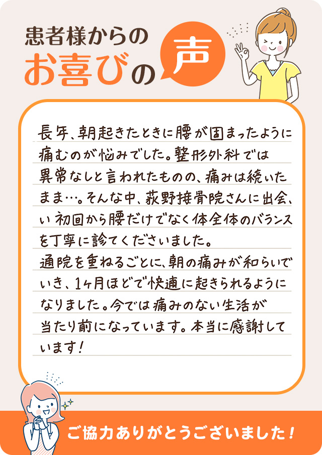 通院を重ねるごとに、朝の痛みが和らいでいき、1ヶ月ほどで快適に起きられるようになりました。