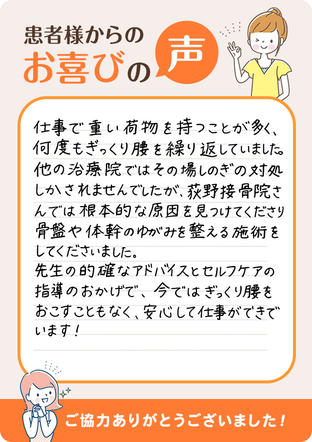 先生の的確なアドバイスとセルフケアの指導のおかげで、今ではぎっくり腰を起こすこともなく、安心して仕事ができています!