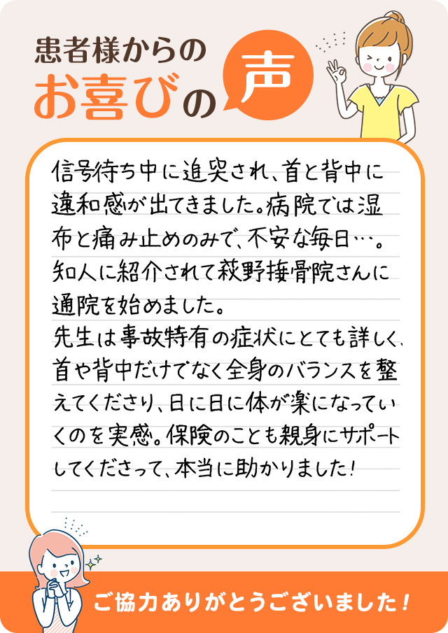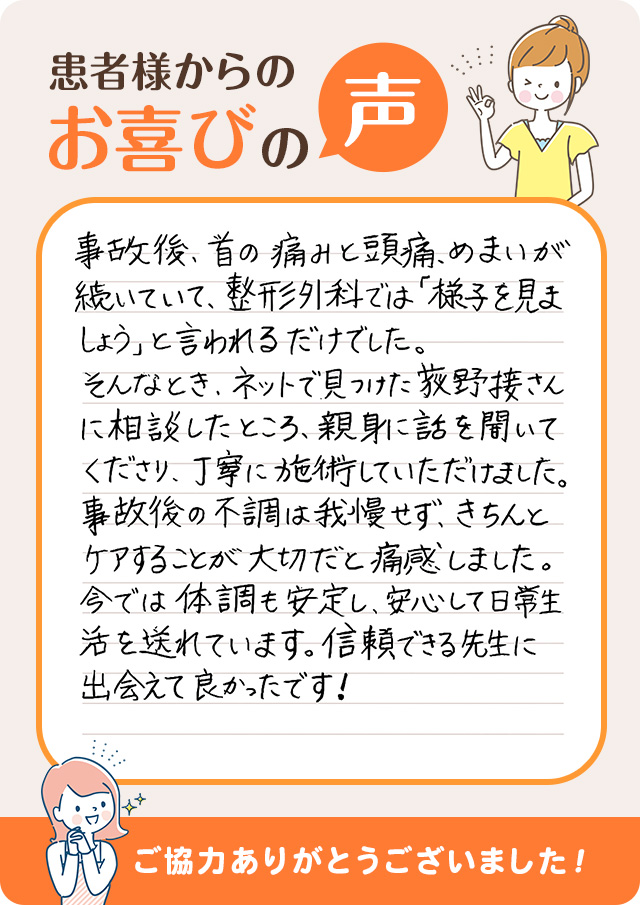 そんなとき、ネットで見つけた荻野接骨院さんに相談したところ、親身に話を聞いてくださり、丁寧に施術していただけました。