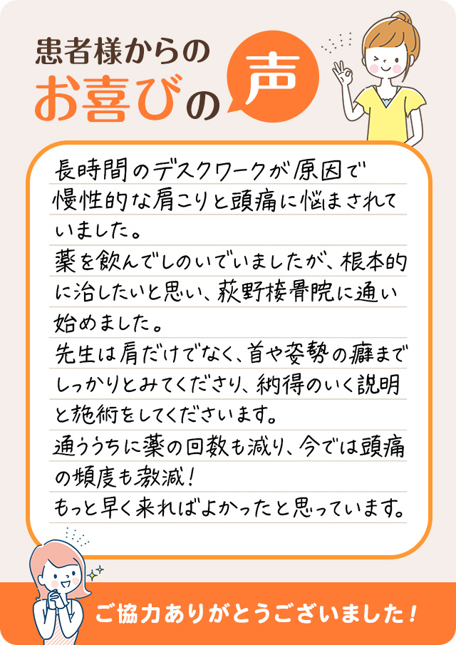 荻野接骨院で施術を受けるようになってから、施術のたびに首と肩が軽くなり、頭もスッキリ!